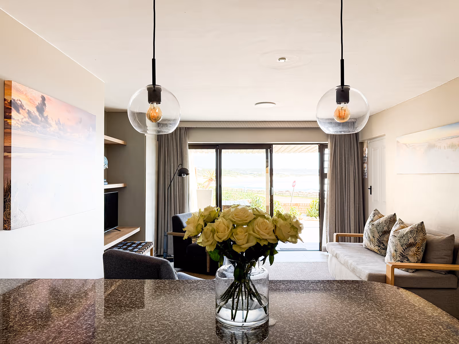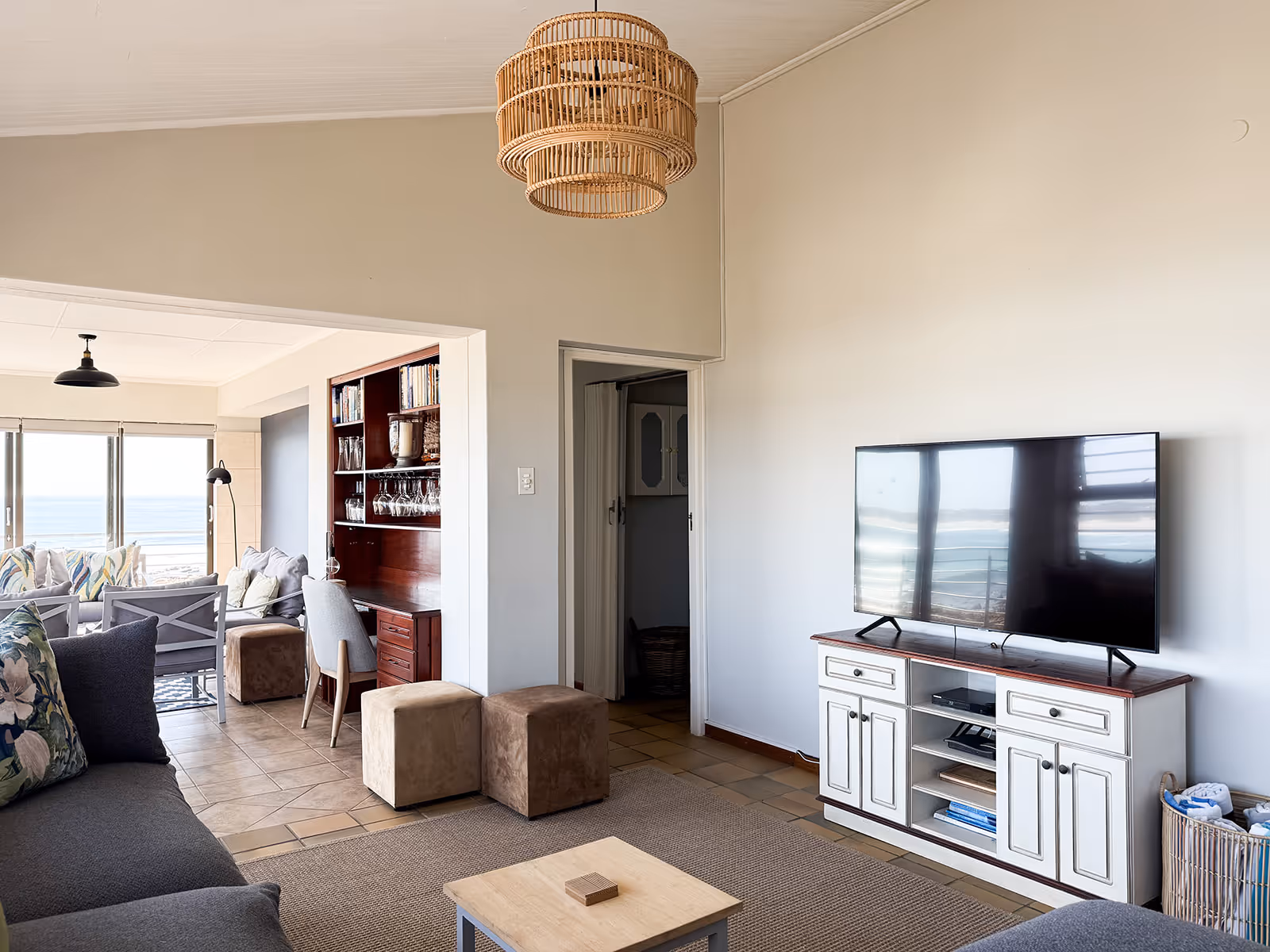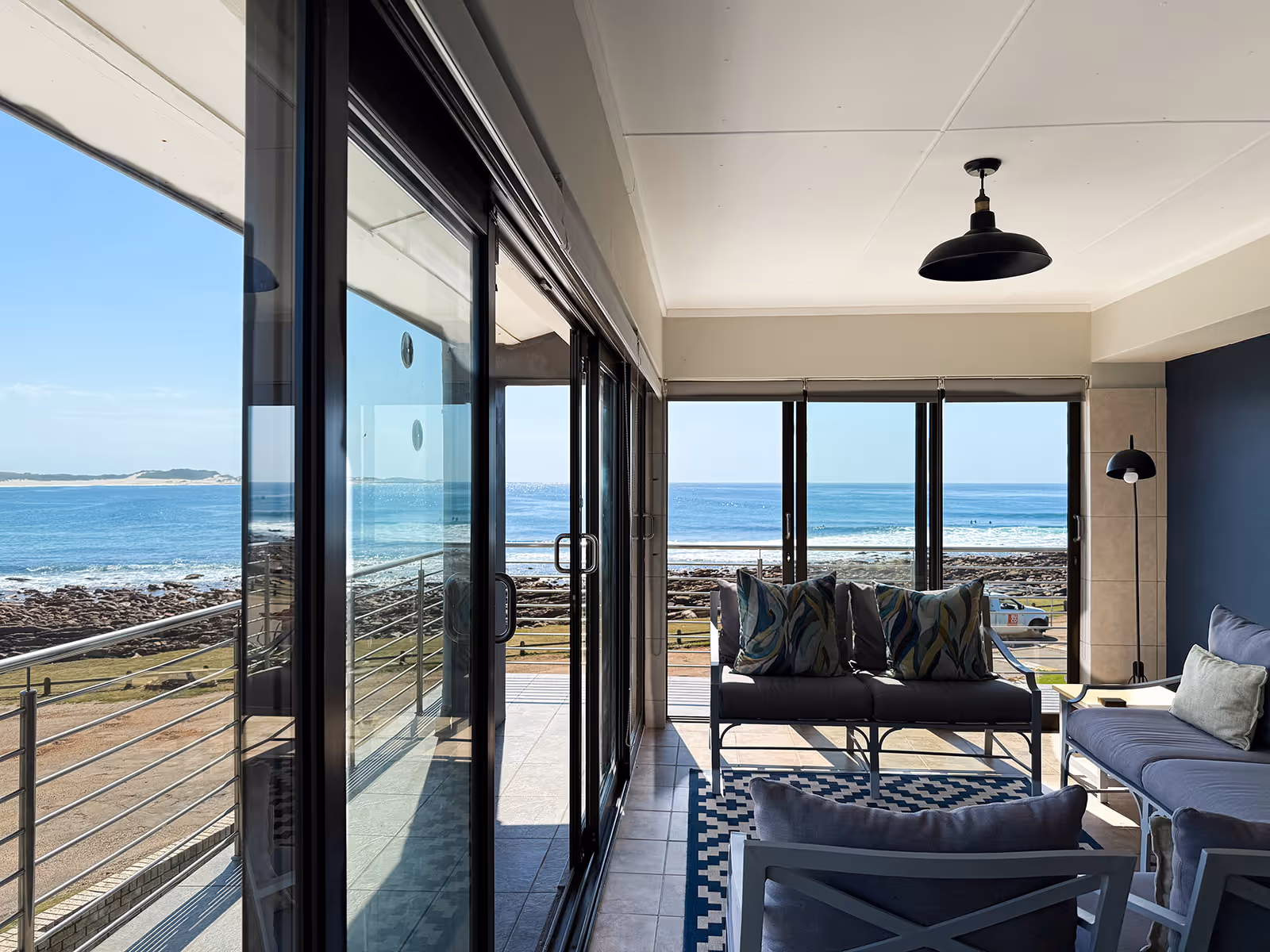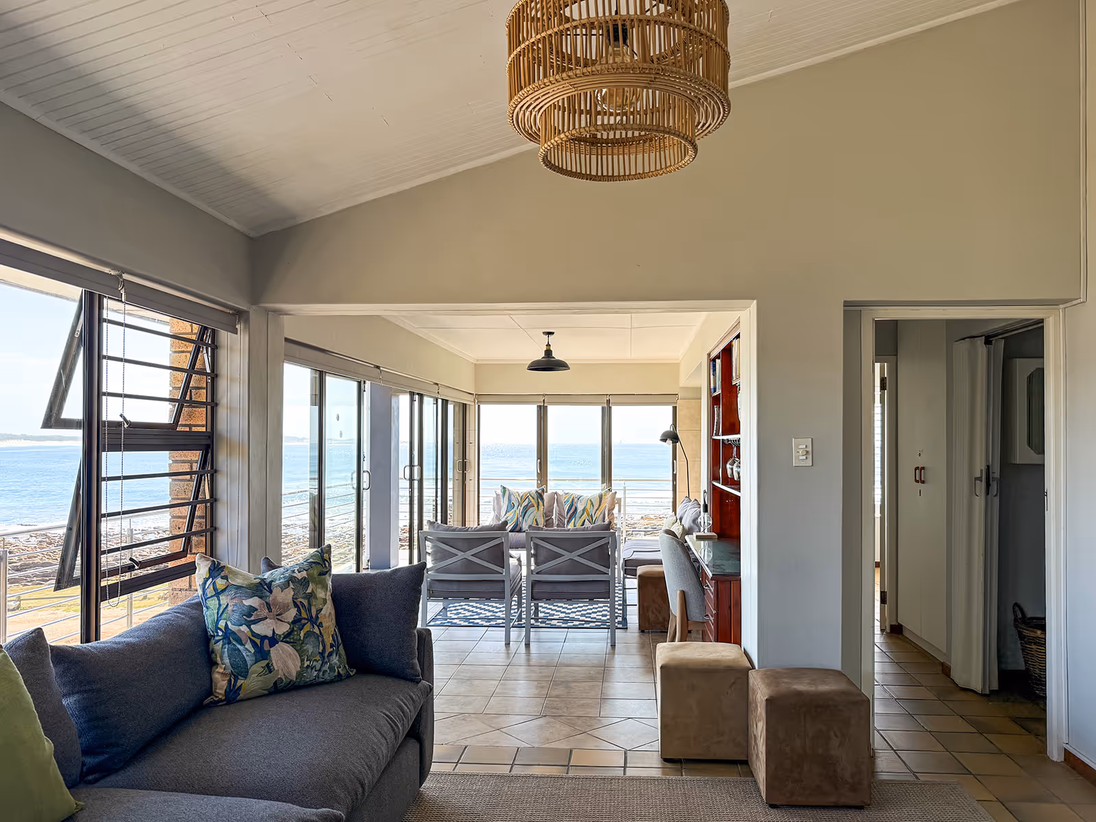 The house has open plan living spaces that feature a palette of colours, inspired by sand and sea.The main lounge has abundant natural light and a wall of windows with a breathtaking view of the water.