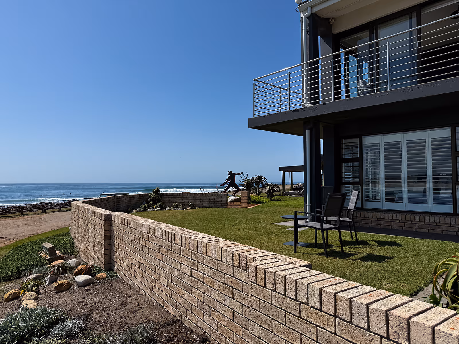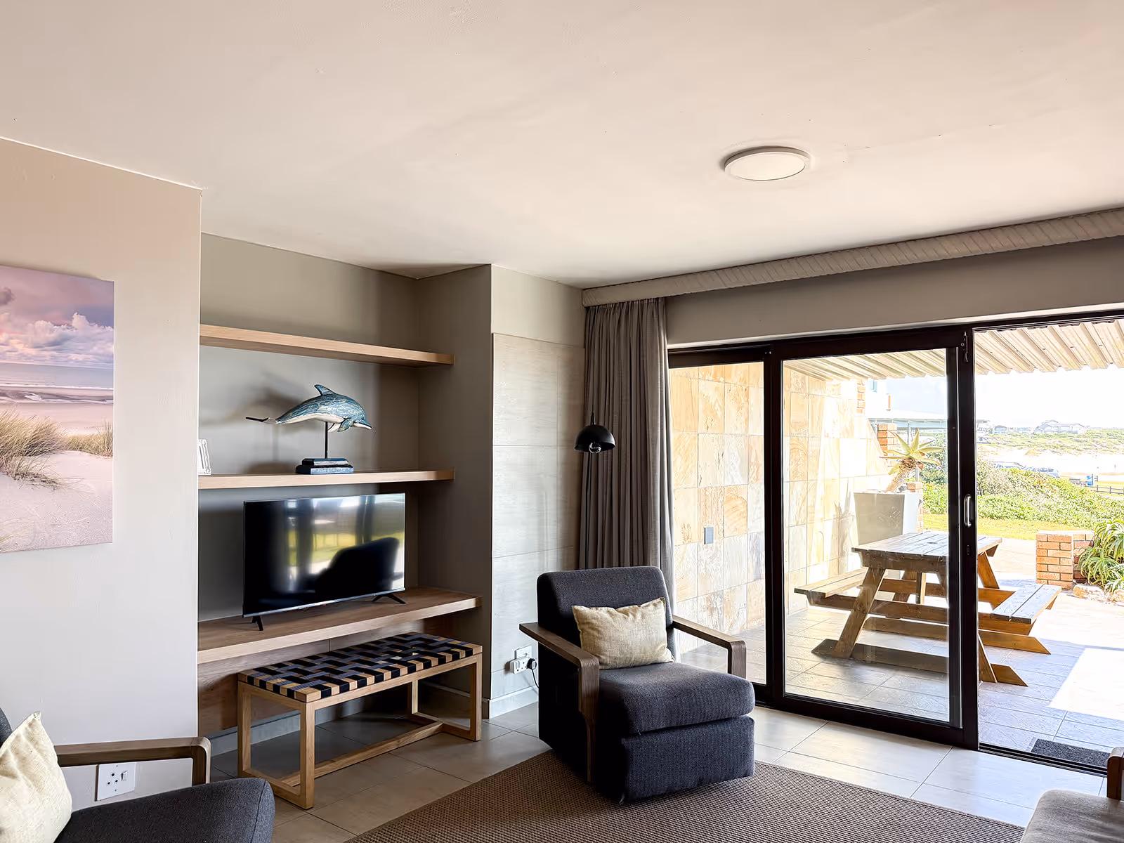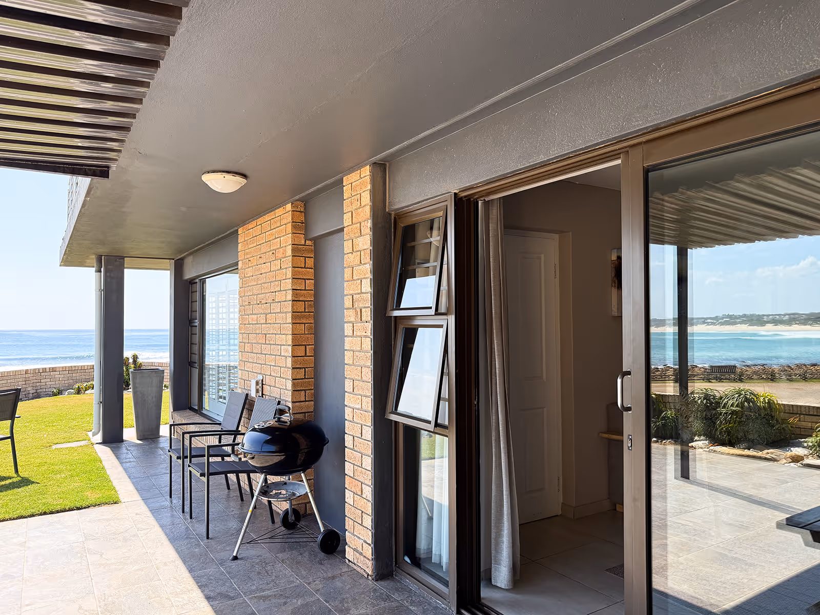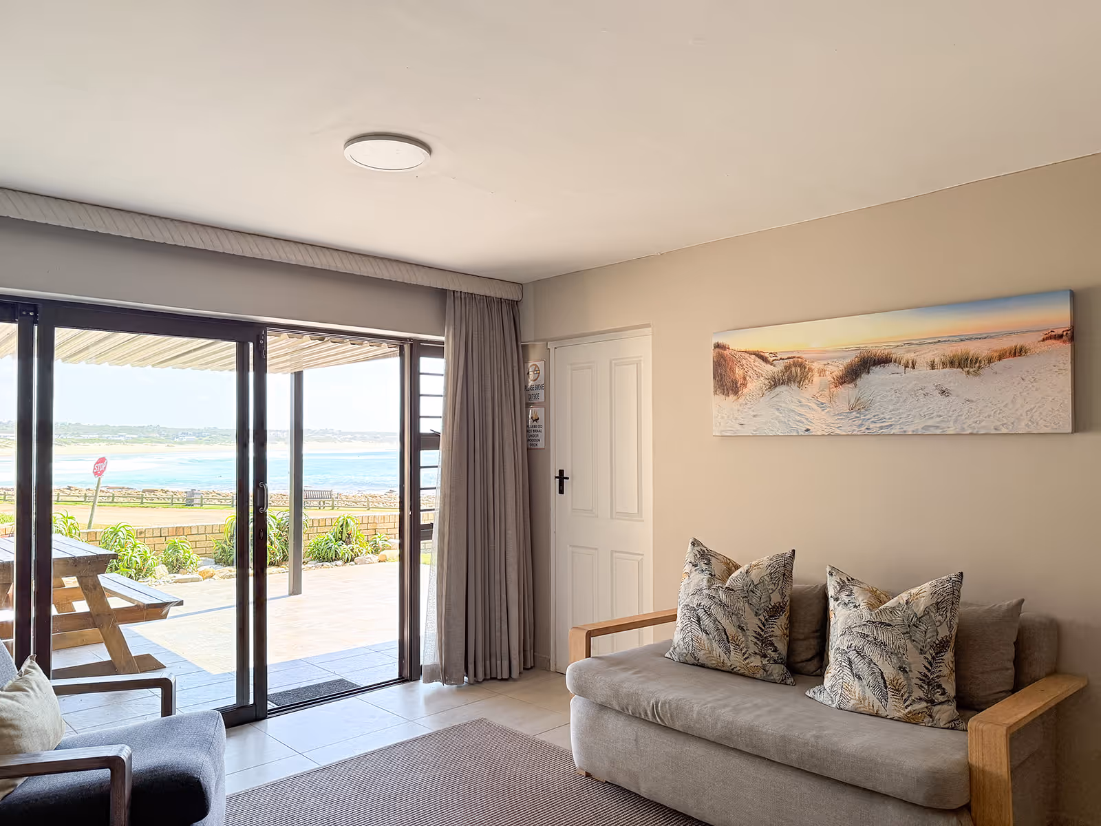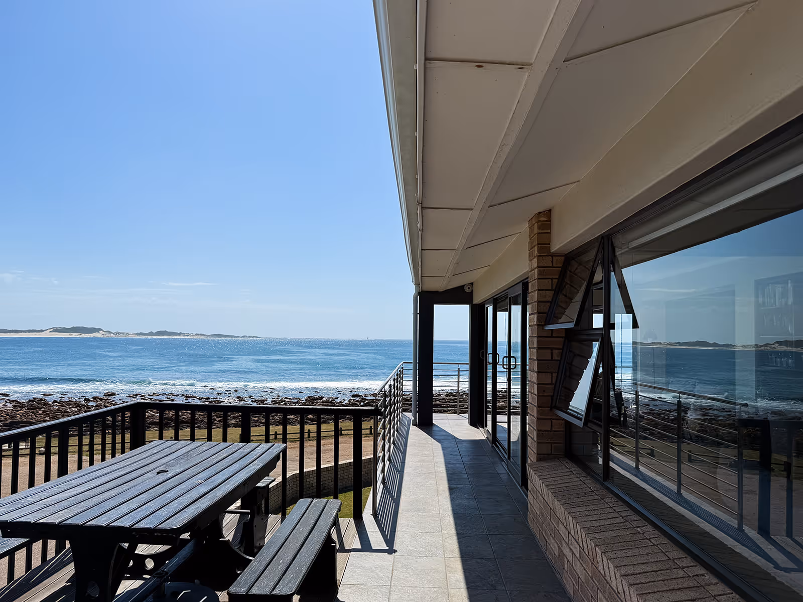 The house has open plan living spaces that feature a palette of colours, inspired by sand and sea.The main lounge has abundant natural light and a wall of windows with a breathtaking view of the water.