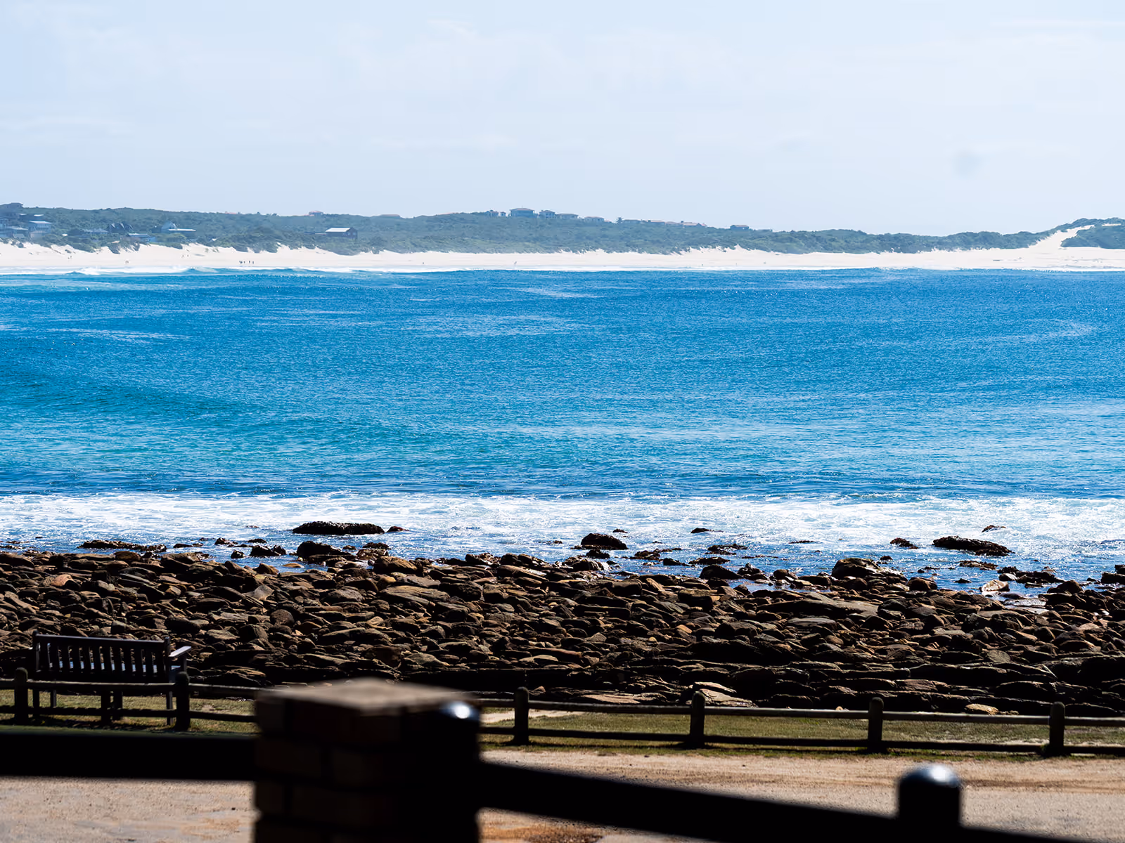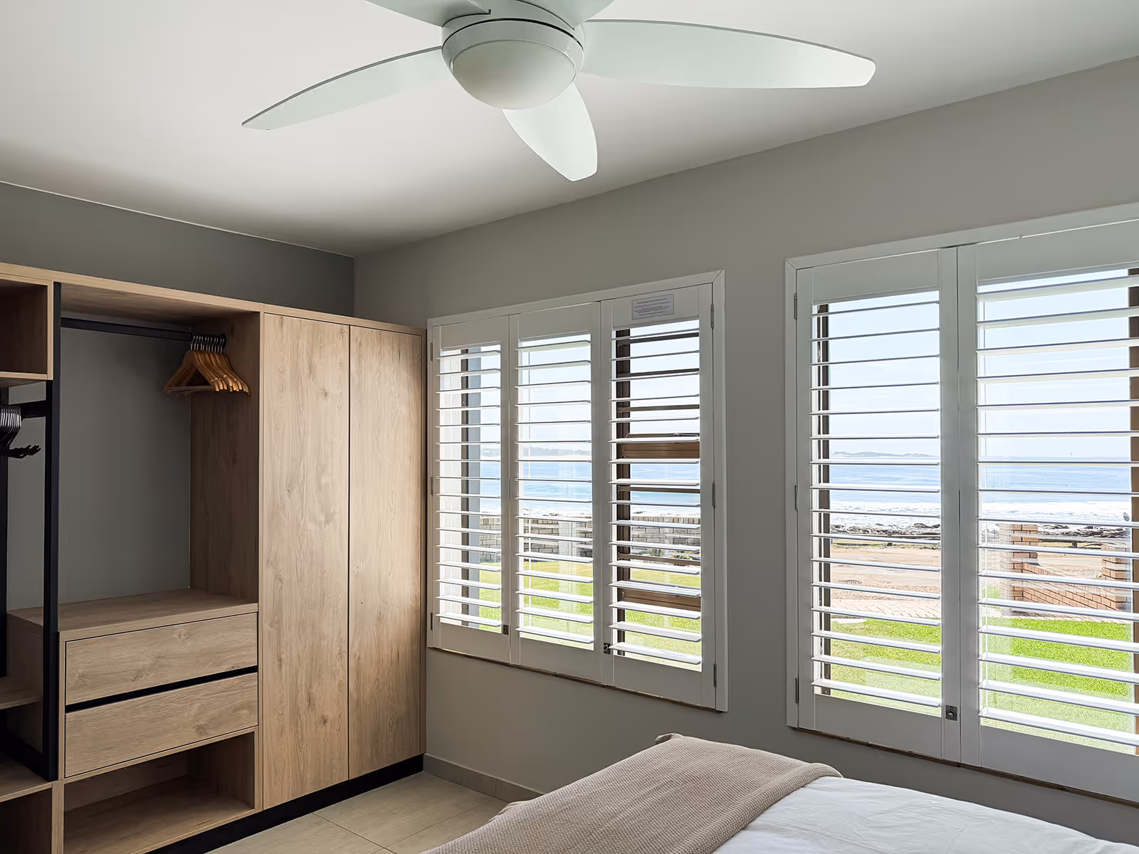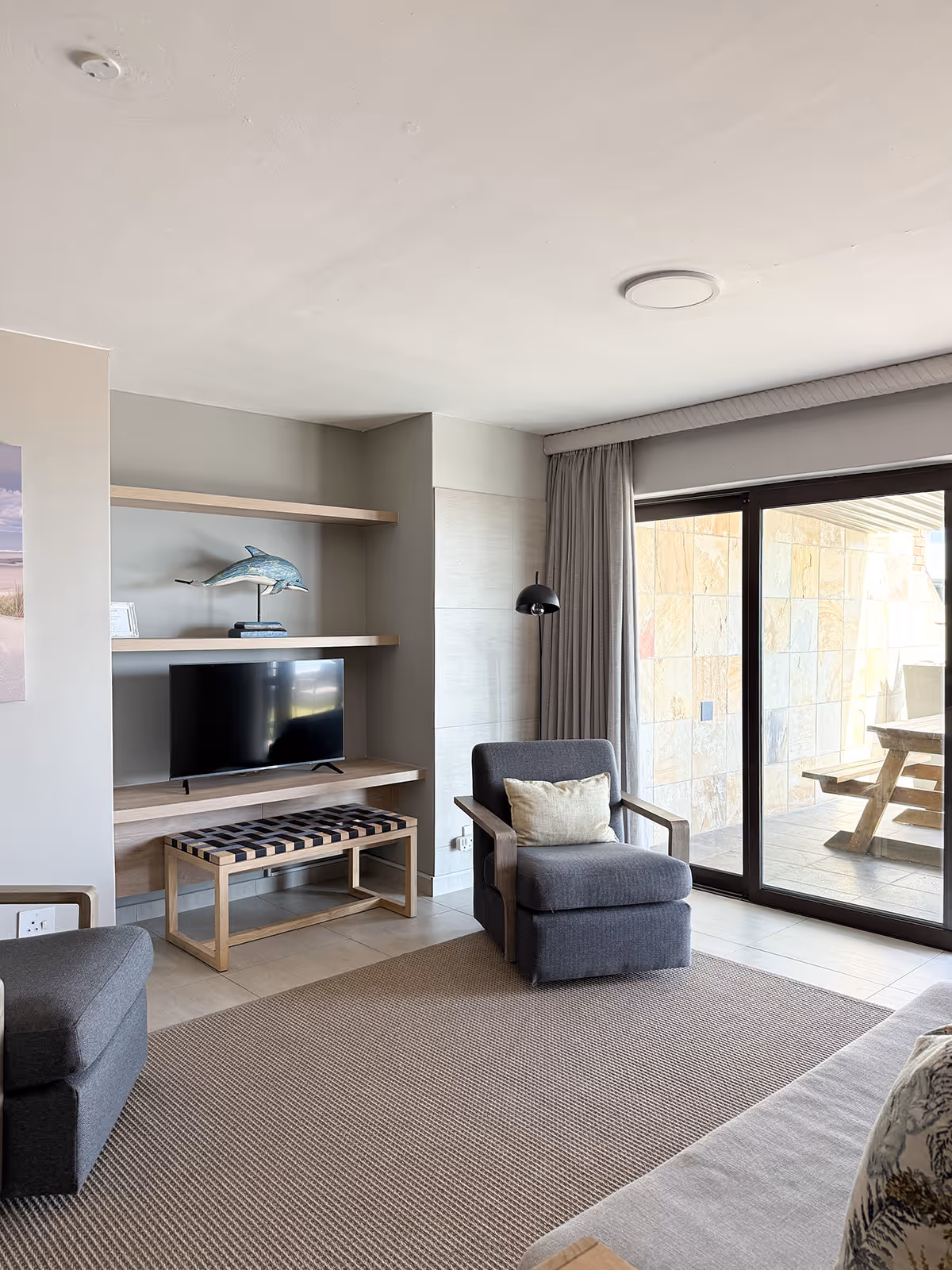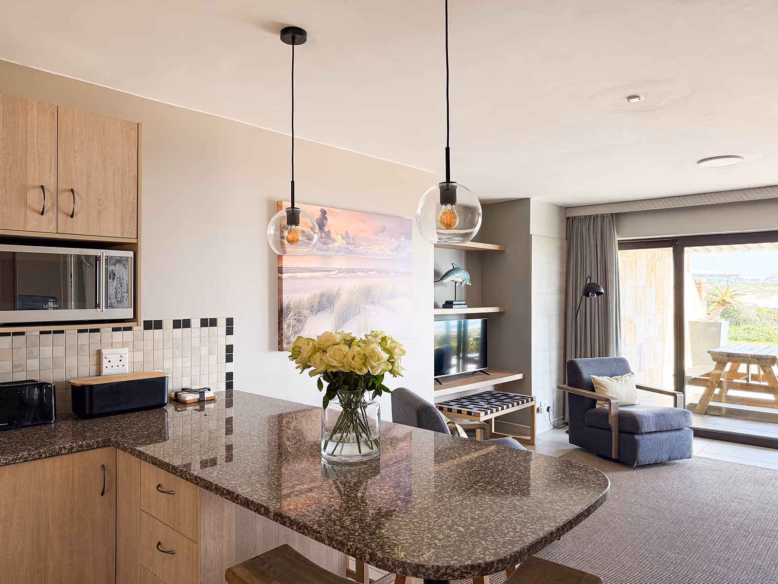 The house has open plan living spaces that feature a palette of colours, inspired by sand and sea.The main lounge has abundant natural light and a wall of windows with a breathtaking view of the water.